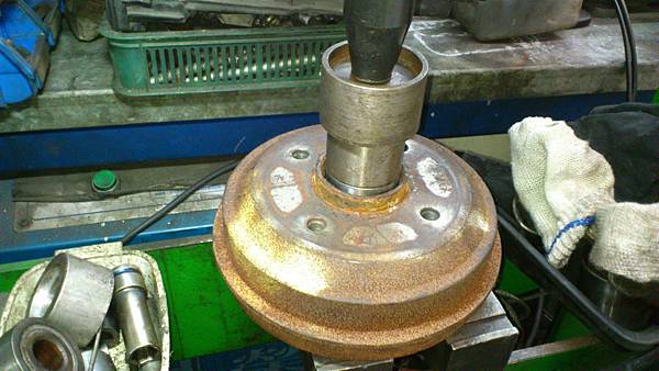 更新後輪軸承.油壓床壓入新的輪軸承.