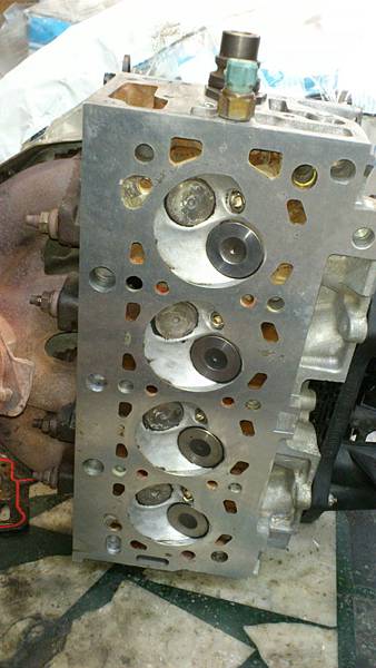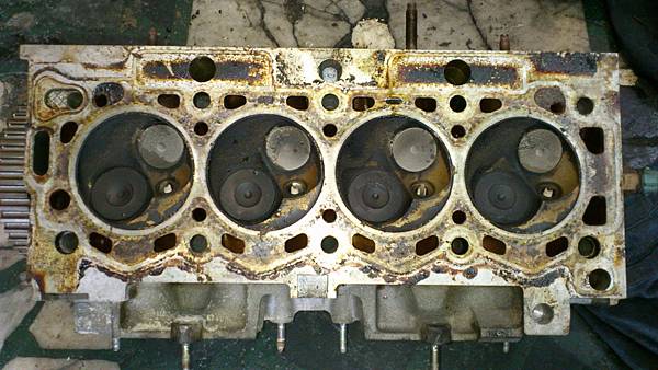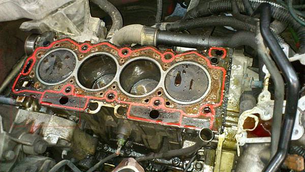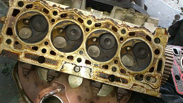 拆卸汽缸頭.發現汽缸床墊片才更換不久.還蠻新的.推猜之前引擎水溫可能有過高過.拆卸汽缸頭整理用很便宜方式處理.留下漏機油的後遺症.