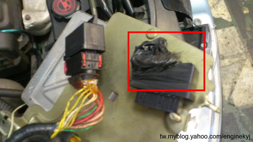 這顆是噴射系統的電源繼電器.已經破裂被纏一坨膠帶.建議車主一起更換掉.