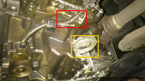 從變速箱底部看.漏變速箱油非常嚴重.簡單外部被封膠無效"黃框".