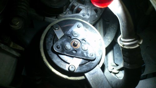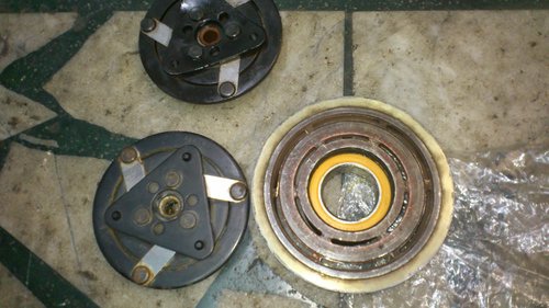 用油壓床逼入新的軸承.找一塊舊的壓縮機離合器壓版.換掉翹得咪咪茂茂的壓版.