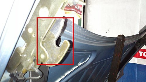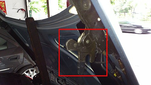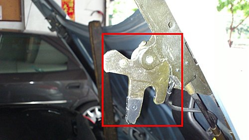 左後油壓桿座拉索磨損脫落.後蓋鎖扣呈現六點半.
