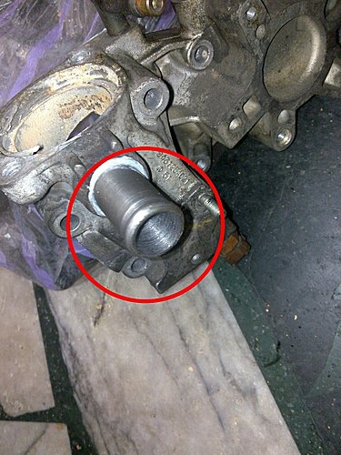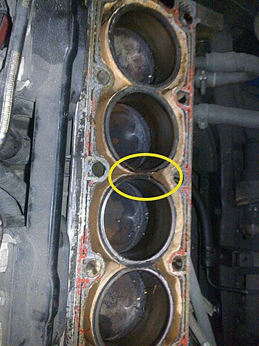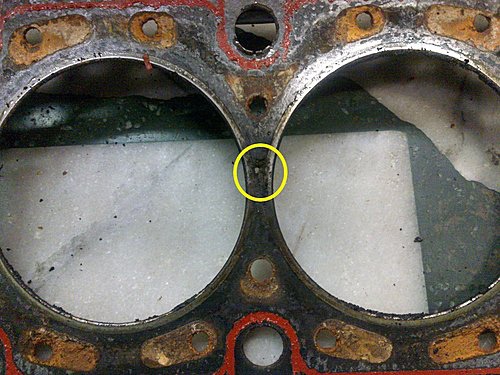 汽缸頭中間對應引擎本體.壓縮壓力滲漏到冷卻水道.