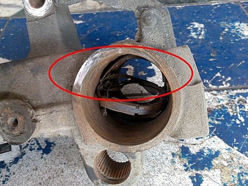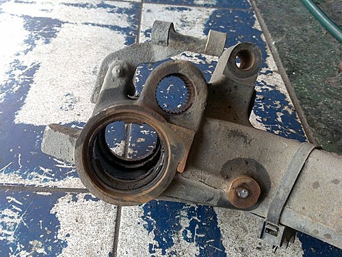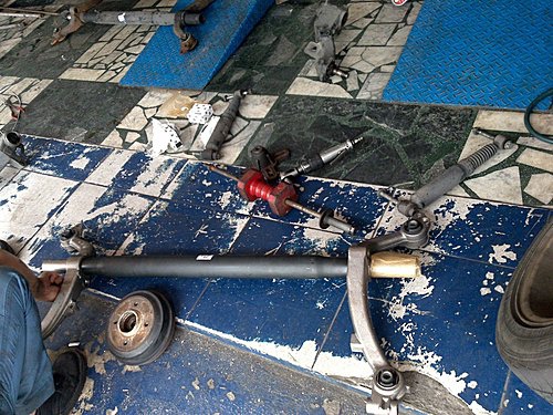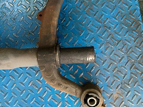 拆下兩支懸吊臂.左後輪懸吊臂軸承.油封已經屍骨無存.還傷到左後輪懸吊臂(牛腿).嚴格說來.後擔.左後懸吊臂.哈夫都要更換掉.但是.幫車主省一點小朋友.把懸吊臂送去給車床加工處理.