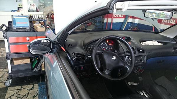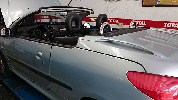 這部2001年206 CC 硬頂敞篷車款.還沒進場前車主來電要修理敞篷打不開問題.開進廠時引擎發動"三腳"抖一下抖一下很不順.
