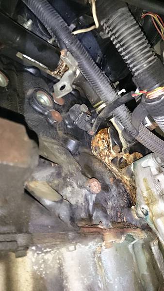 引擎這邊的後水管在漏冷卻水.這支後水管原廠生廠線上是鐵管鉚橡皮管.橡皮的部分已經被冷卻水的壓力吹脹的像氣球.鉚合的地方狂滴冷卻水.