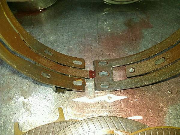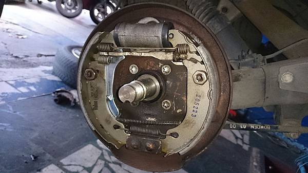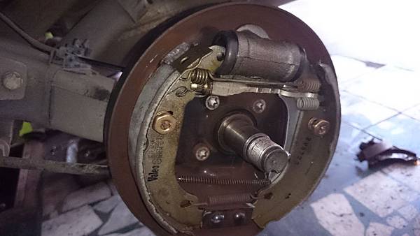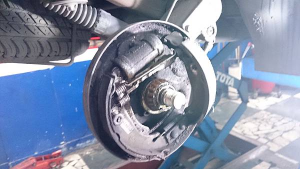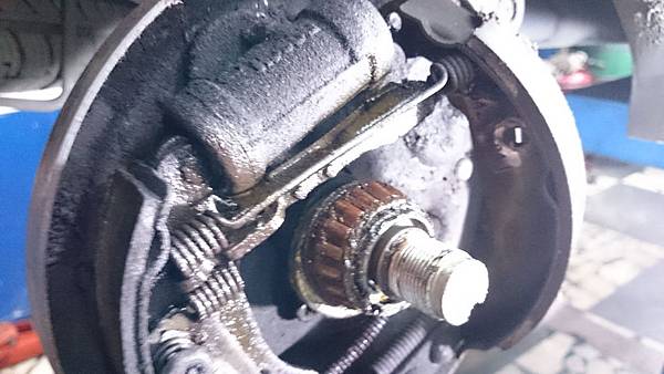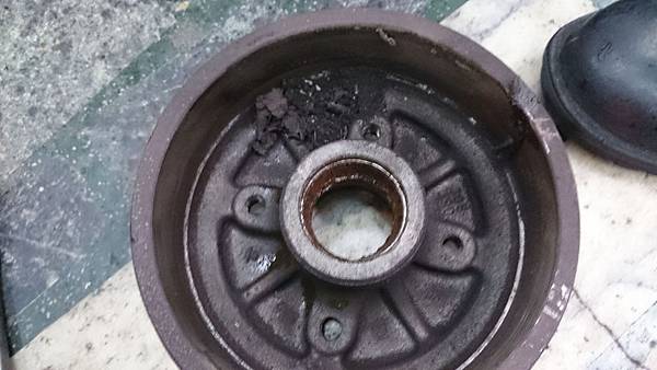 煞車分幫漏油.煞車蹄片整個泡到煞車油而發脹.把煞車鼓咬住連拆都拆不下來.特殊工具滑槌拉到整支崩牙.