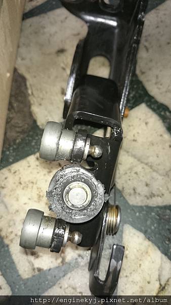 拆卸下來的左下滑動支架.明顯看到軸承都已經磨損成橢圓形.