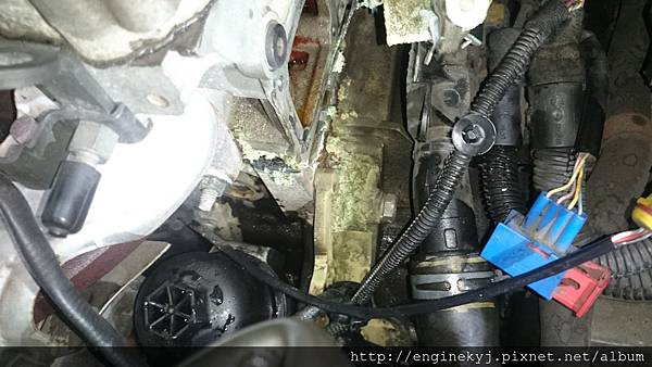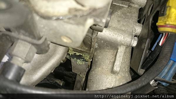 漏引擎冷卻水的位置.地點有一點模糊.剛好界於汽缸床與節溫器座之間.