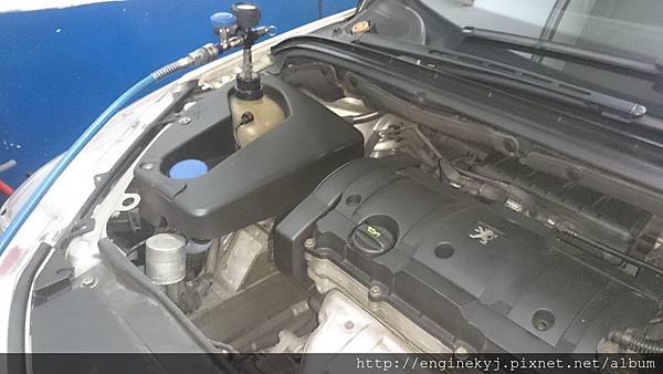 清潔處理好之後.用加壓表對引擎冷卻系統加壓測漏確認.