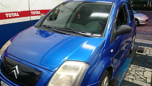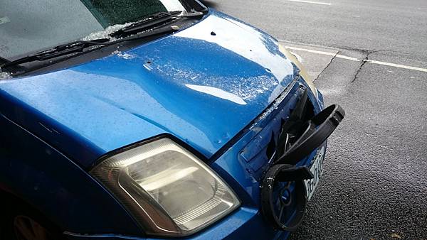 雪鐵龍C2中秋節颱風馬勒卡造孽.不知被哪家大樓的血滴子吹落擊中.