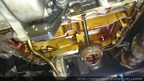 檢查完 曲軸前油封及引擎油底殼嚴重滲漏機油.
