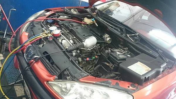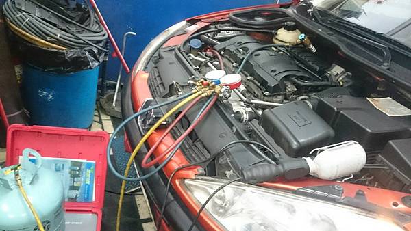 冷氣系統加壓測漏. 更換掉引擎室的冷排.