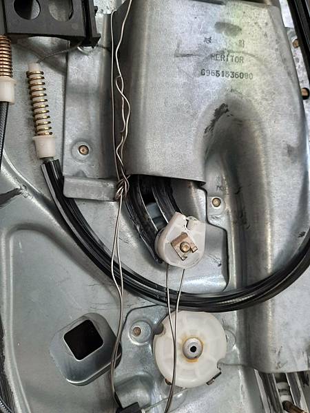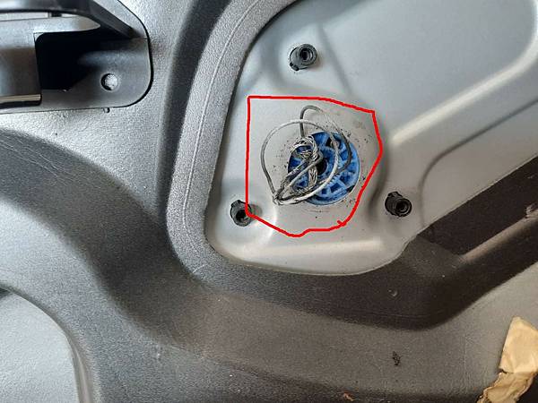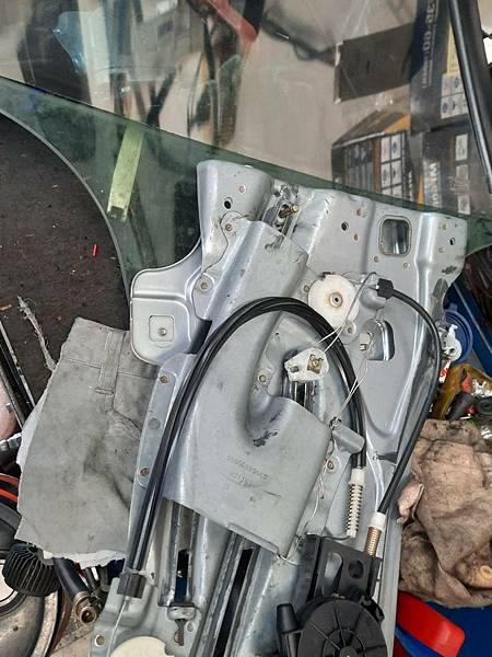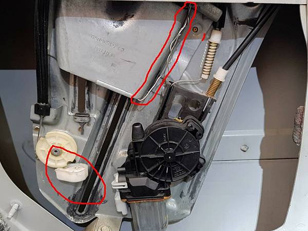 左後三角窗升降機滑塊破裂.用鐵絲綑綁.不讓玻璃往下掉.