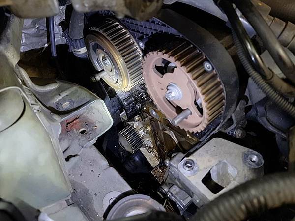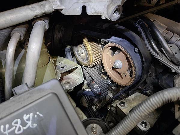 漏機油處理完.上正時皮帶惰輪組.空間很小作業要小心.