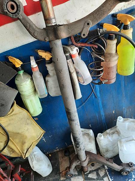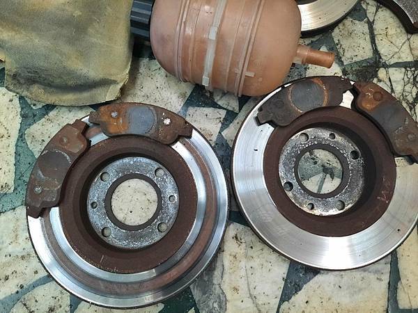 更換掉的前煞車盤及來令片組.冷卻系統的副水箱.