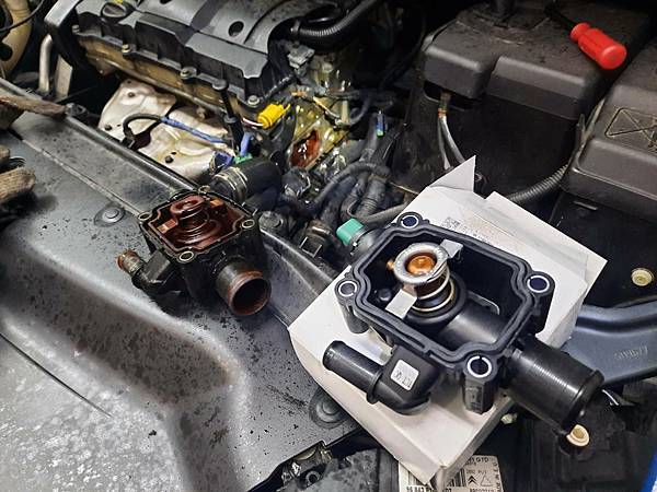 頂車起來檢查曲軸前油封特濕.還發現節溫器座漏引擎冷卻水.