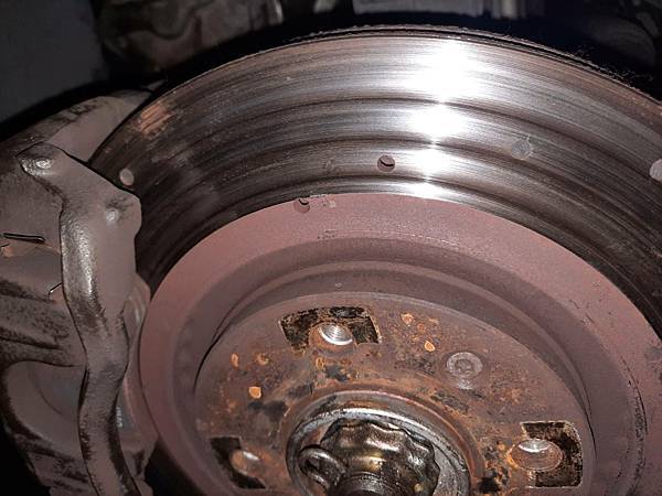 煞車盤2.0磨損凹陷.煞車片裝1.6.少了3分之1的磨擦面積.