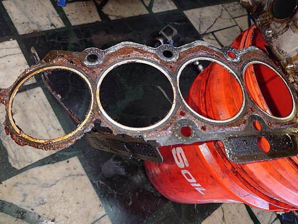 爛掉的原廠石綿汽缸床墊片.