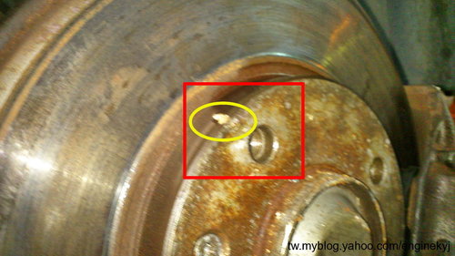 輪胎螺絲內牙壞掉了.原來.之前就有人做了孔位記號在上面.