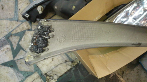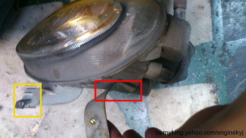 右邊的霧燈進水生鏽.拆下來看.原來是之前撞到固定腳斷掉.黃色匡的地方無法固定住霧燈.